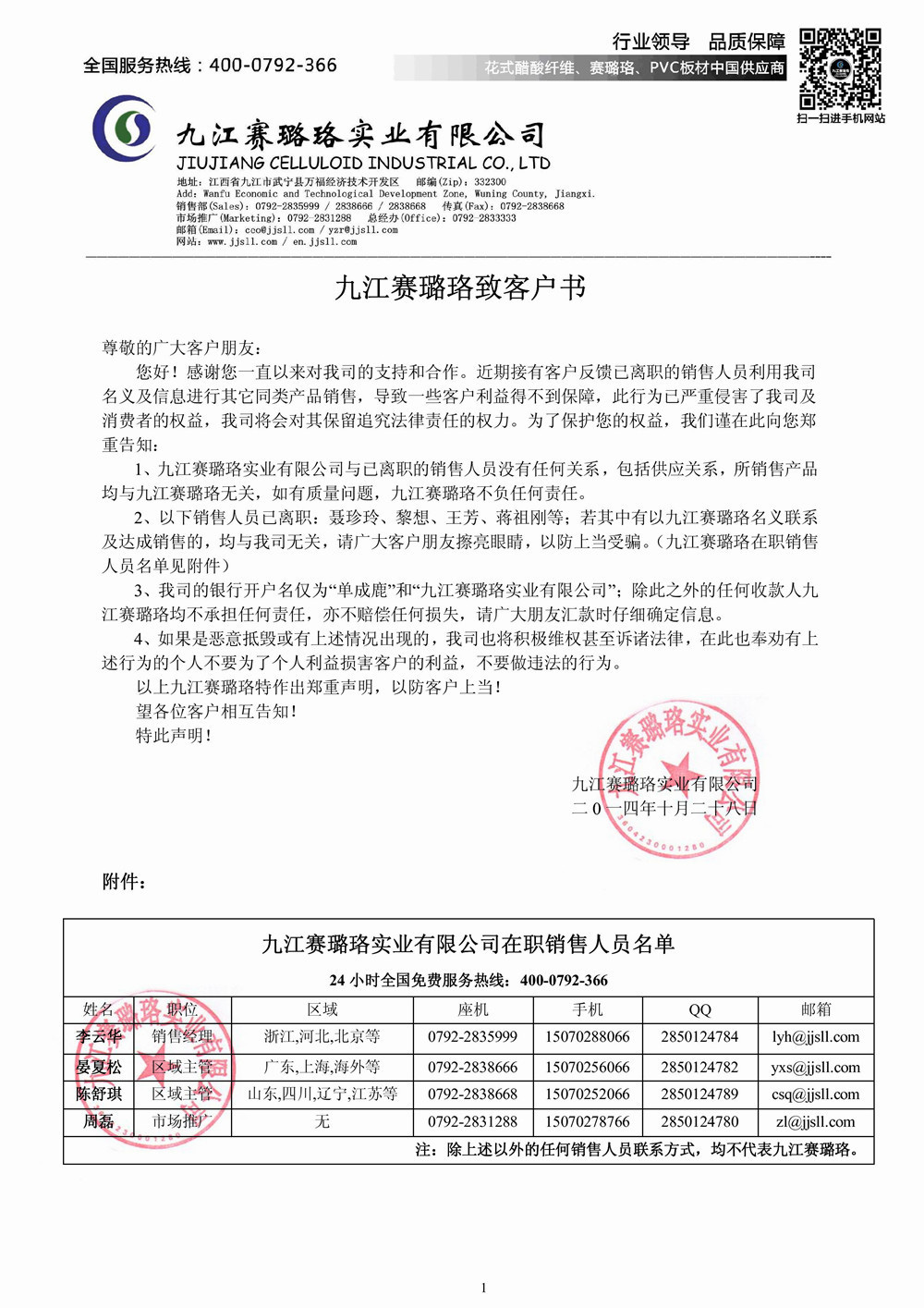 2、以下銷售人員已離職:聶珍玲、黎想、王芳、蔣祖剛等;若其中有以九江賽璐珞名義聯(lián)系及達(dá)成銷售的,均與我司無關(guān),請廣大客戶朋友擦亮眼睛,以防上當(dāng)受騙。(九江賽璐珞在職銷售人員名單見附件)