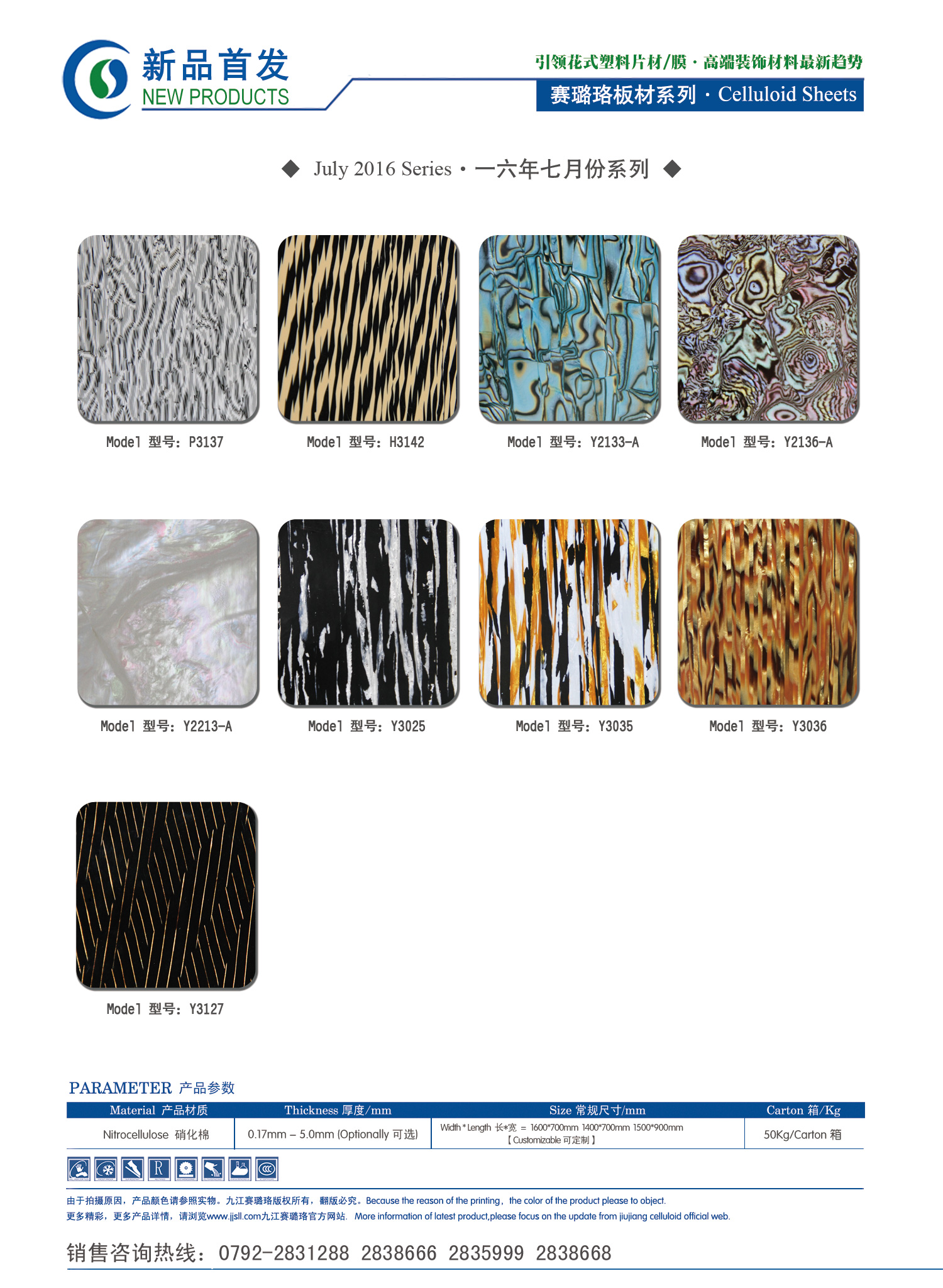 九江賽璐珞實(shí)業(yè)有限公司2016年七月份賽璐珞板材、瑪瑙膜、理石膜、樂器裝飾材料、花式PVC片材新品發(fā)布,引領(lǐng)花式塑料片材/膜·高端裝飾材料最新趨勢(shì)。咨詢熱線:0792-2838668 / 2838666 / 2835999。