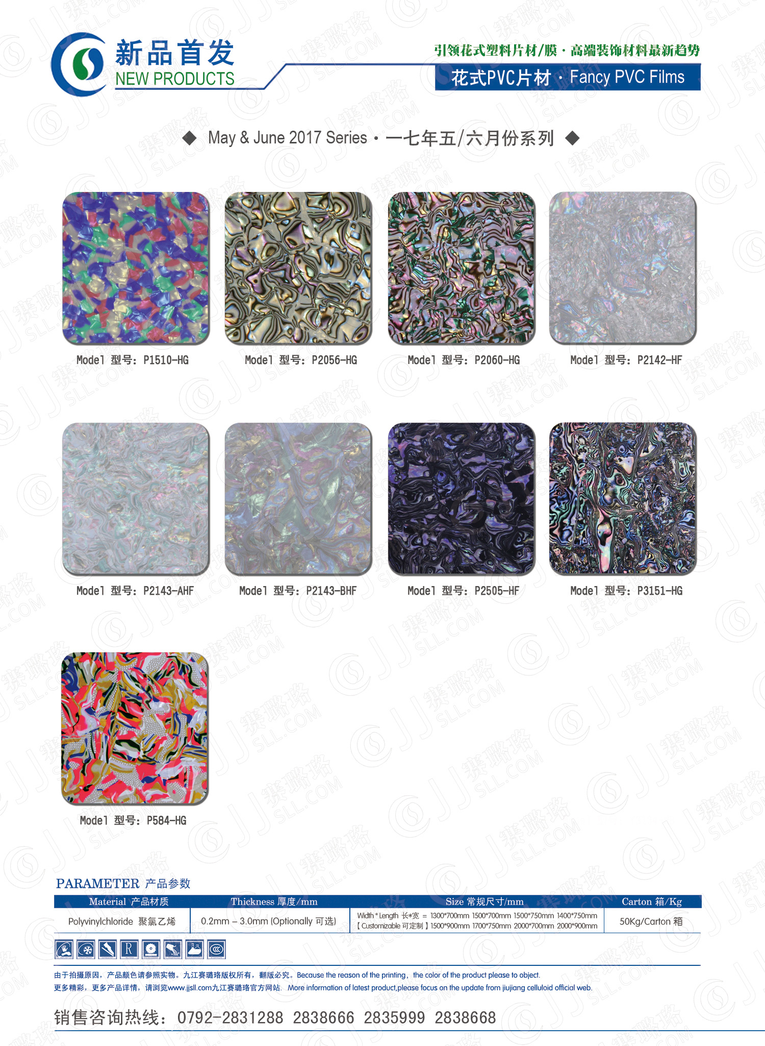 九江賽璐珞實(shí)業(yè)有限公司2017年五月及六月份賽璐珞板材、瑪瑙膜、理石膜、樂器裝飾材料、花式PVC片材新品發(fā)布,花式塑料片材/膜·多彩裝飾材料先驅(qū)者。咨詢熱線:0792-2838668 / 2831288 / 2838666 / 2835999。點(diǎn)擊圖片查看詳細(xì)產(chǎn)品